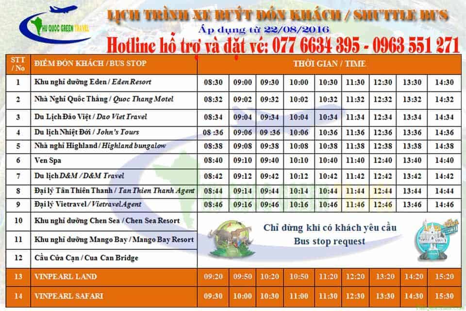 Cụ thể lịch trình đón khách của xe bus Vinpearl Phú Quốc như sau: Resort Novotel – Mường Thanh Luxury ( chuyến 8h45 , 9h15) <=> Khu nghỉ dưỡng Eden<=>Nhà nghỉ Quốc Thắng<=>Du lịch Đảo Việt<=>Du lịch Nhiệt Đới<=>Nhà nghỉ Highland<=>Ven Spa<=>Khách sạn Galaxy<=>Khách sạn Hiệp Thoại<=>Đại lý Việt Travel<=>Khách sạn Huy Hoàng<=>Đại lý Trường Vũ<=>Chen Sea resort<=>Đại lý Nam Thắng<=>Cầu Cửa Cạn.